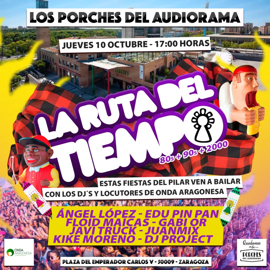 Este próximo jueves 10 de octubre volvemos a Zaragoza, estaremos de «Tardeo» con los amigos de la emisora de radio, Onda Aragonesa en la terraza de Los Porches del Audiorama con la fiesta «La Ruta del Tiempo».